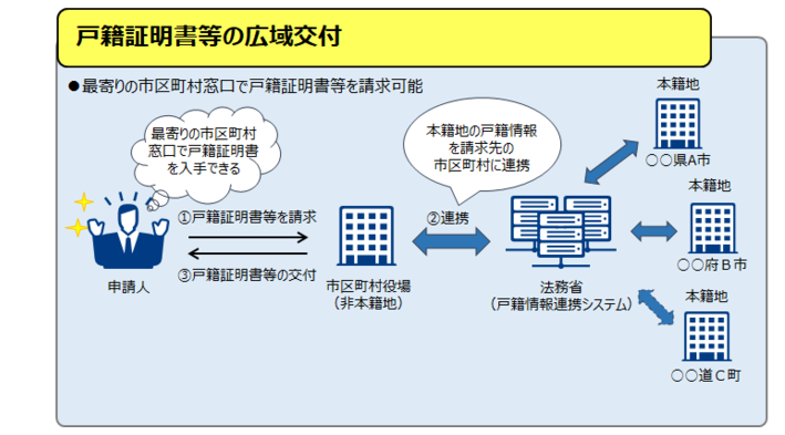相続人である子どもが市区町村役場の窓口に出向けば、広域交付を利用することができます。