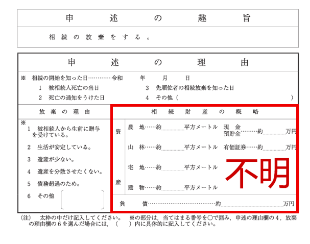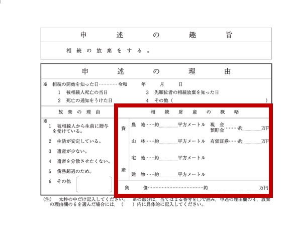 相続財産の概略欄に記載した財産も記載していない財産も、すべて相続することはできません。